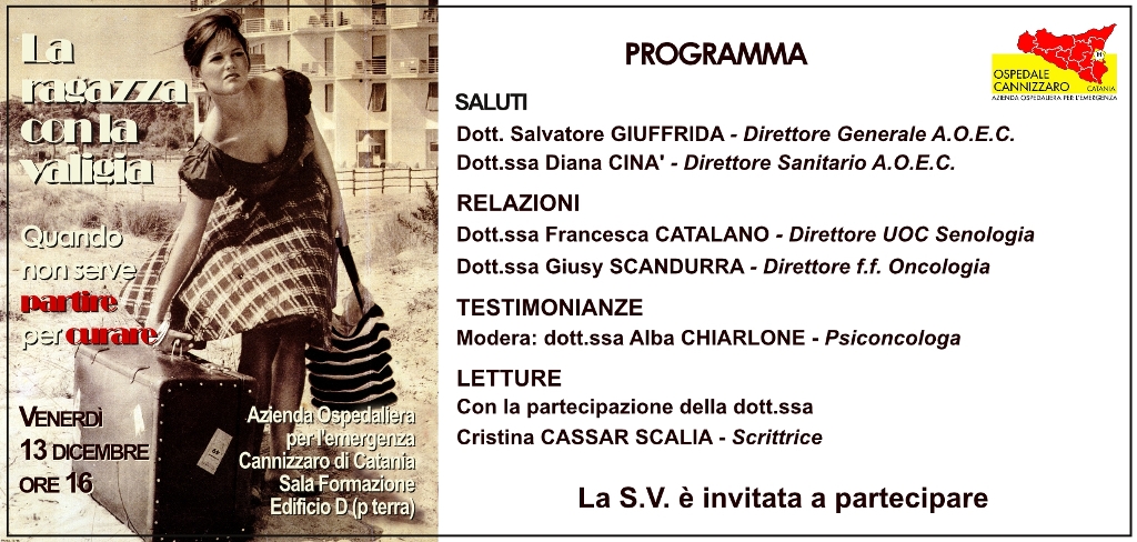 «Oggi le donne siciliane non sono più costrette ai “viaggi della speranza”: possono essere curate ed assistite con amore e competenza senza dover lasciare casa, affetti, professione. Oggi possono parlare dei viaggi che hanno scelto per piacere e non di quelli cui non sono più costrette». È questo lo spirito dell’incontro dal titolo “La ragazza con la valigia. Quando non serve partire per curare”, organizzato dalle Unità Operative di Senologia e di Oncologia dell’Azienda ospedaliera Cannizzaro di Catania, per venerdì 13 dicembre dalle ore 16, nella sala a piano terra dell’edificio D (Amministrazione).