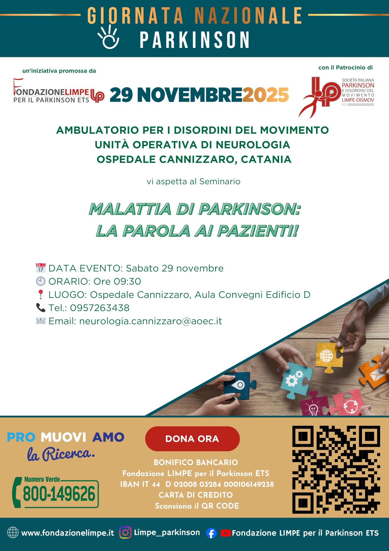 Il prossimo sabato 29 novembre, Giornata Nazionale della malattia di Parkinson, nell’Azienda Ospedaliera Cannizzaro si svolgerà un incontro di aggiornamento, informazione e confronto tra pazienti, familiari e operatori.