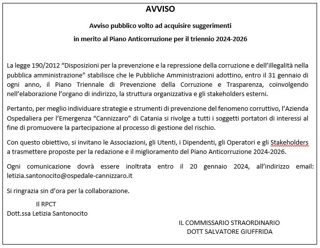 Pertanto, per meglio individuare strategie e strumenti di prevenzione del fenomeno corruttivo, l’Azienda Ospedaliera per l’Emergenza “Cannizzaro” di Catania si rivolge a tutti i soggetti portatori di interessi al fine di promuovere la partecipazione al processo di gestione del rischio.