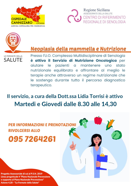 Presso l'Unità Operativa Complessa Multidisciplinare di Senologia è attivo il Servizio di Nutrizione Oncologica per aiutare le pazienti a mantenere uno stato nutrizionale equilibrato e affrontare al meglio le terapie anche attraverso un regime nutrizionale che le sostenga durante tutto il percorso diagnostico terapeutico.