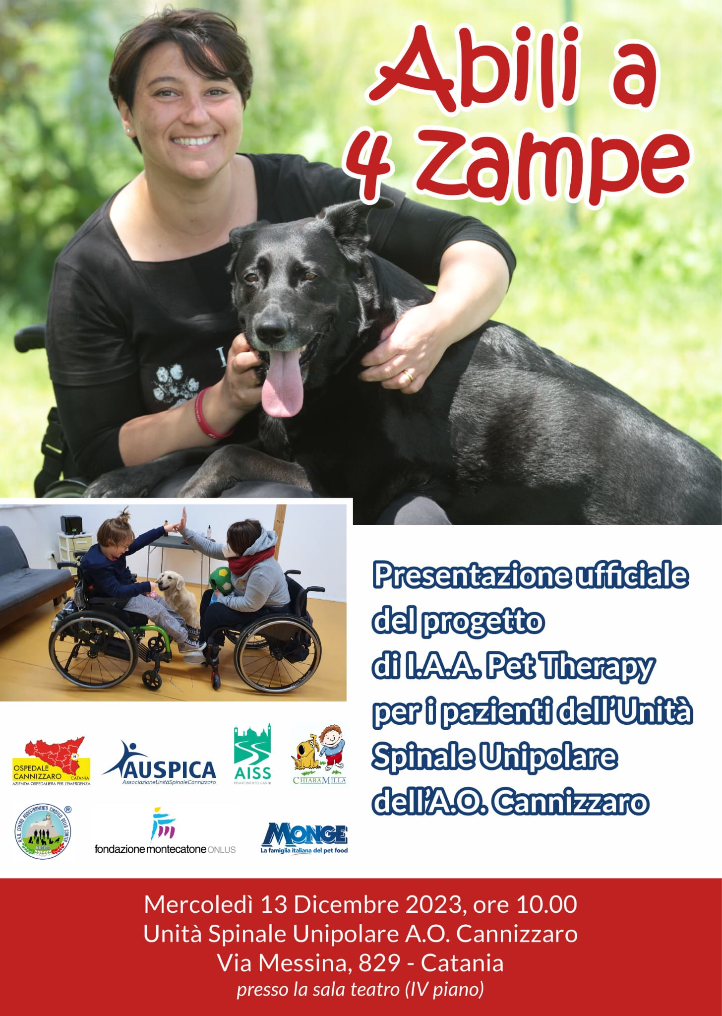 Promosso dall’Associazione Unità Spinale Cannizzaro (A.U.Spi.Ca), l’Intervento Assistito con gli Animali (IAA) si basa sull’esperienza decennale del Montecatone Rehabilitation Institute di Bologna, dove opera l’associazione Chiaramilla. Il progetto sarà parte integrante del percorso riabilitativo delle persone con lesione midollare, contribuendo a migliorare la qualità della vita dei pazienti, attivare e sostenere le risorse e le potenzialità di crescita e progettualità individuale, favorire l’inserimento sociale secondo buone prassi già sperimentate.