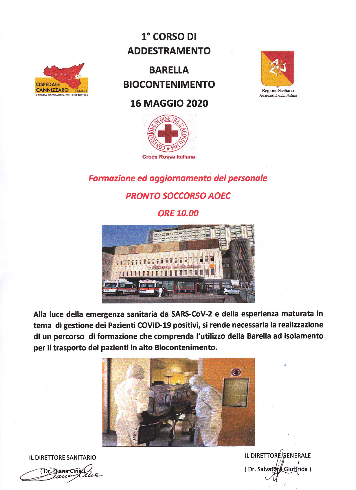 L’Azienda Ospedaliera Cannizzaro, in collaborazione con il Comitato di Catania della Croce Rossa Italiana, ha organizzato il primo corso di addestramento all’utilizzo della barella di biocontenimento, necessaria nel trasporto di pazienti che richiedono alto isolamento per patologie diffusive. Si tratta di una procedura adottata nel corso dell’emergenza sanitaria da Sars-CoV-2 e consolidata grazie all’esperienza maturata in tema di gestione dei pazienti Covid-19 positivi.