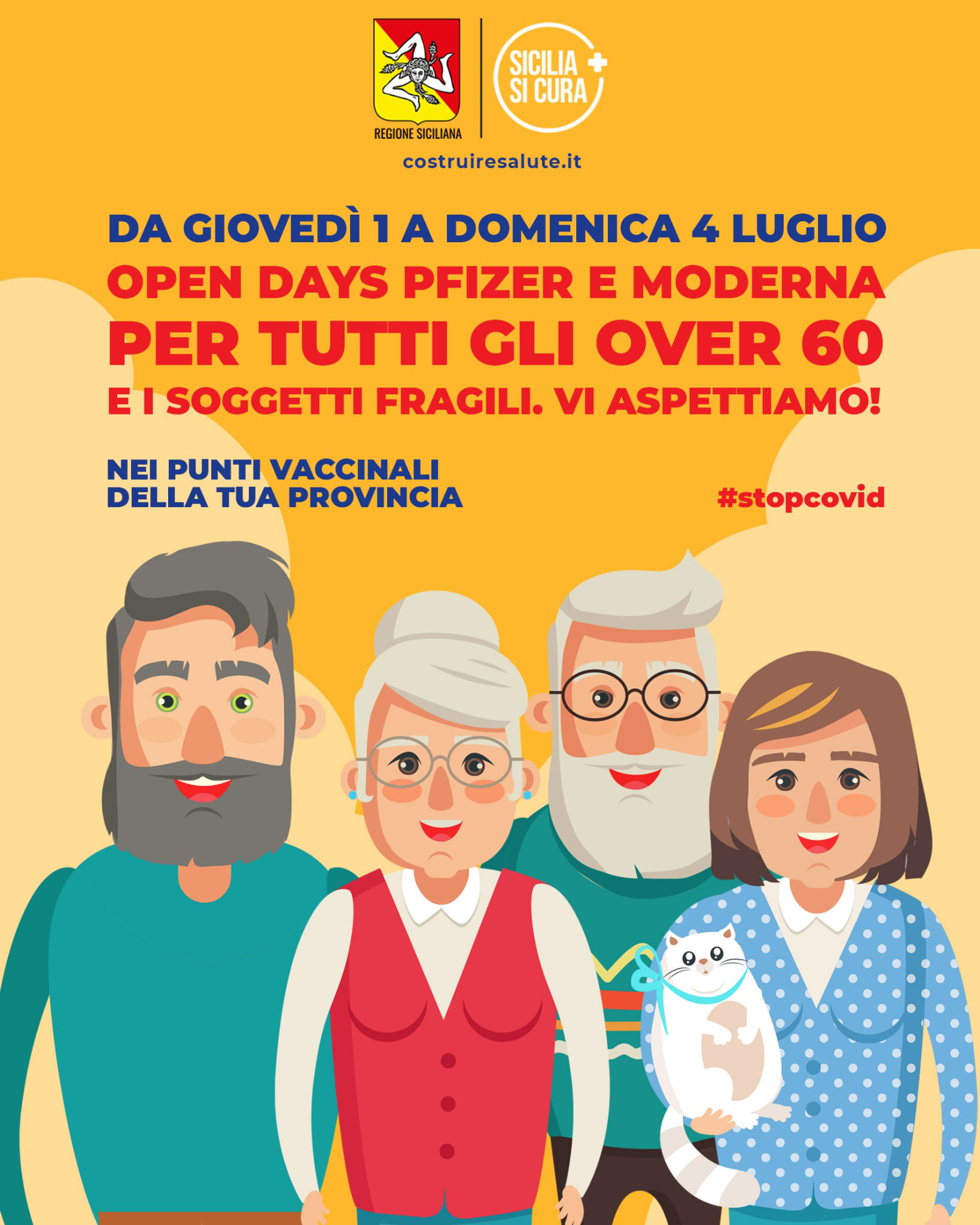 Tornano gli "Open days" in tutti i punti vaccinali delle province siciliane. L'iniziativa, da giovedì 1 luglio fino a domenica 4 luglio, è rivolta ai soggetti fragili e a quelli di età pari o superiore a 60 anni che in questi quattro giorni potranno ricevere il vaccino Pfizer o Moderna senza prenotazione. L'obiettivo è quello di sensibilizzare ulteriormente la popolazione, anche alla luce della diffusione delle varianti. Lo comunica l'assessorato alla Salute della Regione Siciliana.